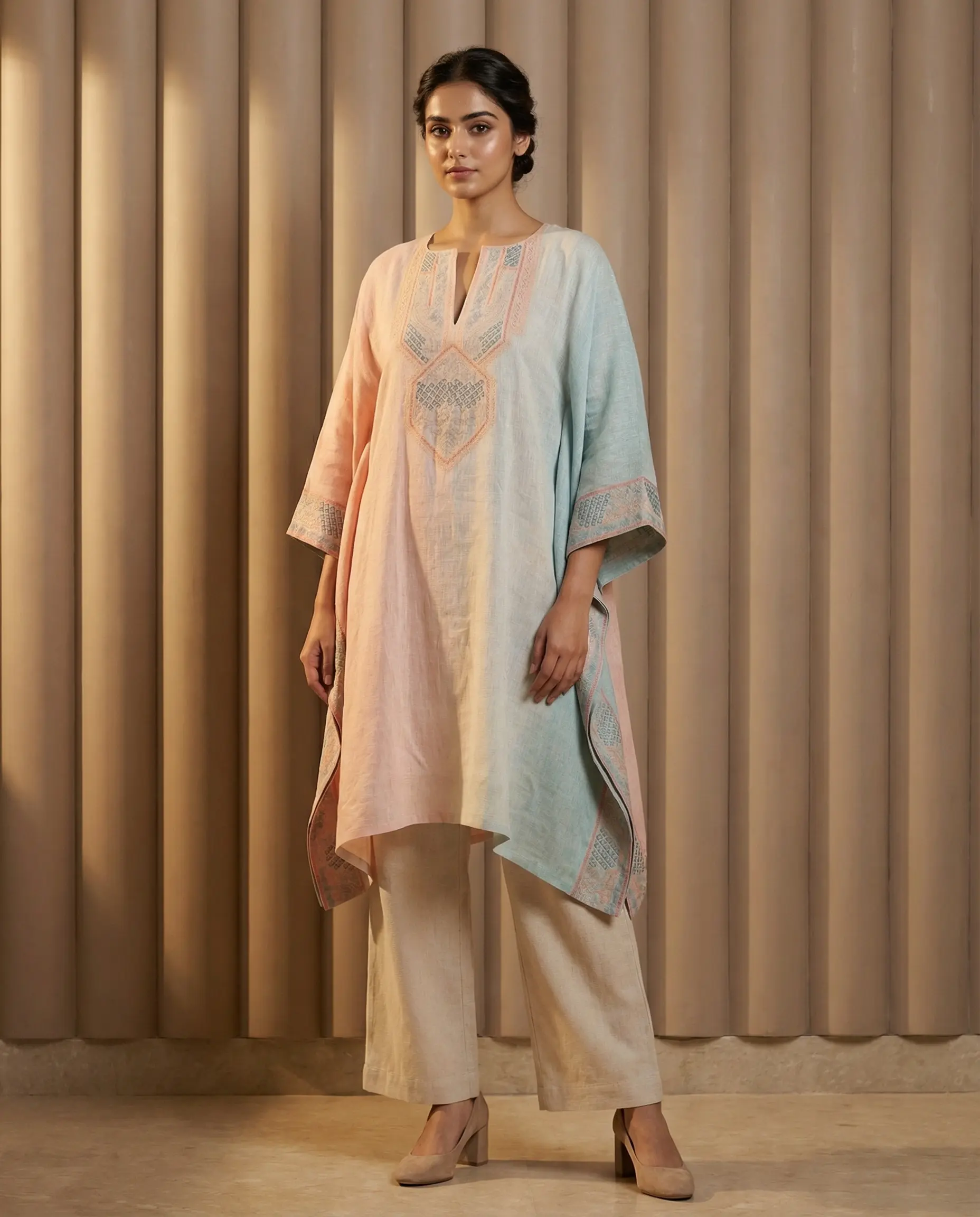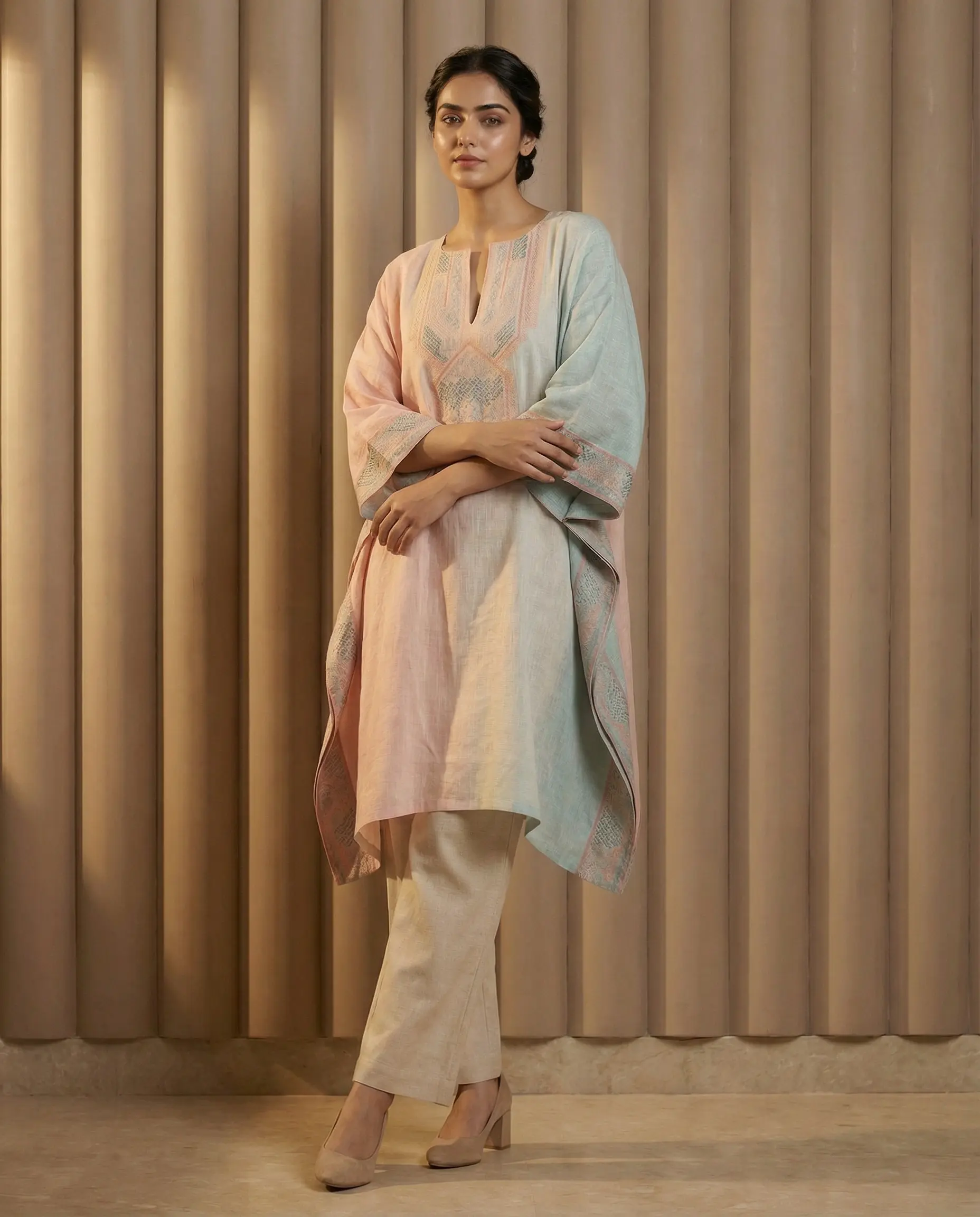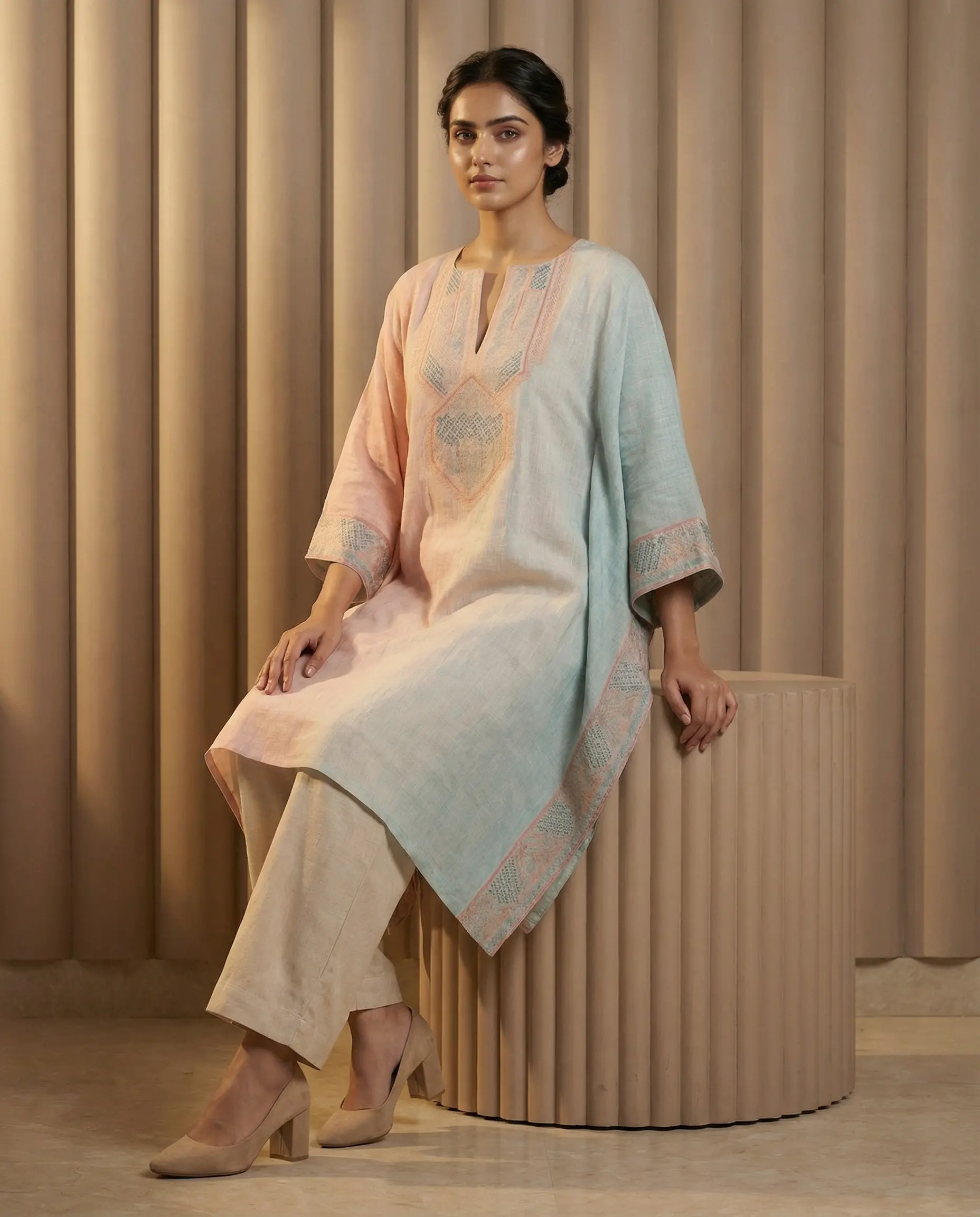 Crafted in pure linen, this elegant kurta features fine delicate embroidery that adds subtle texture and artisanal charm. The soft pastel tones enhance its light, breathable feel, making it perfect for effortless everyday elegance.